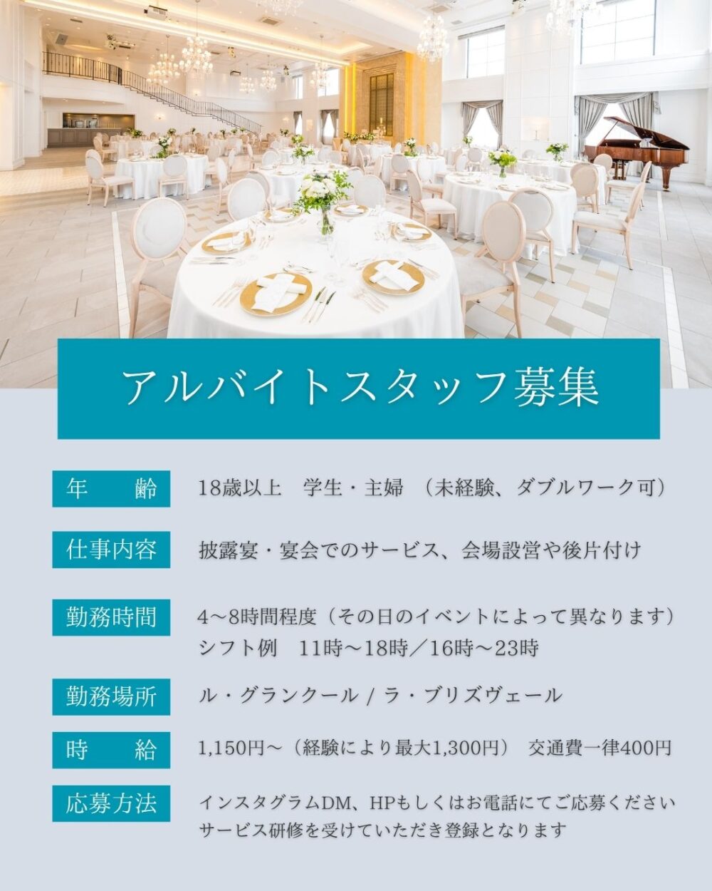 ご応募される方は履歴書のご用意の上、インスタグラム、HPまたはお電話にてお問い合わせください。